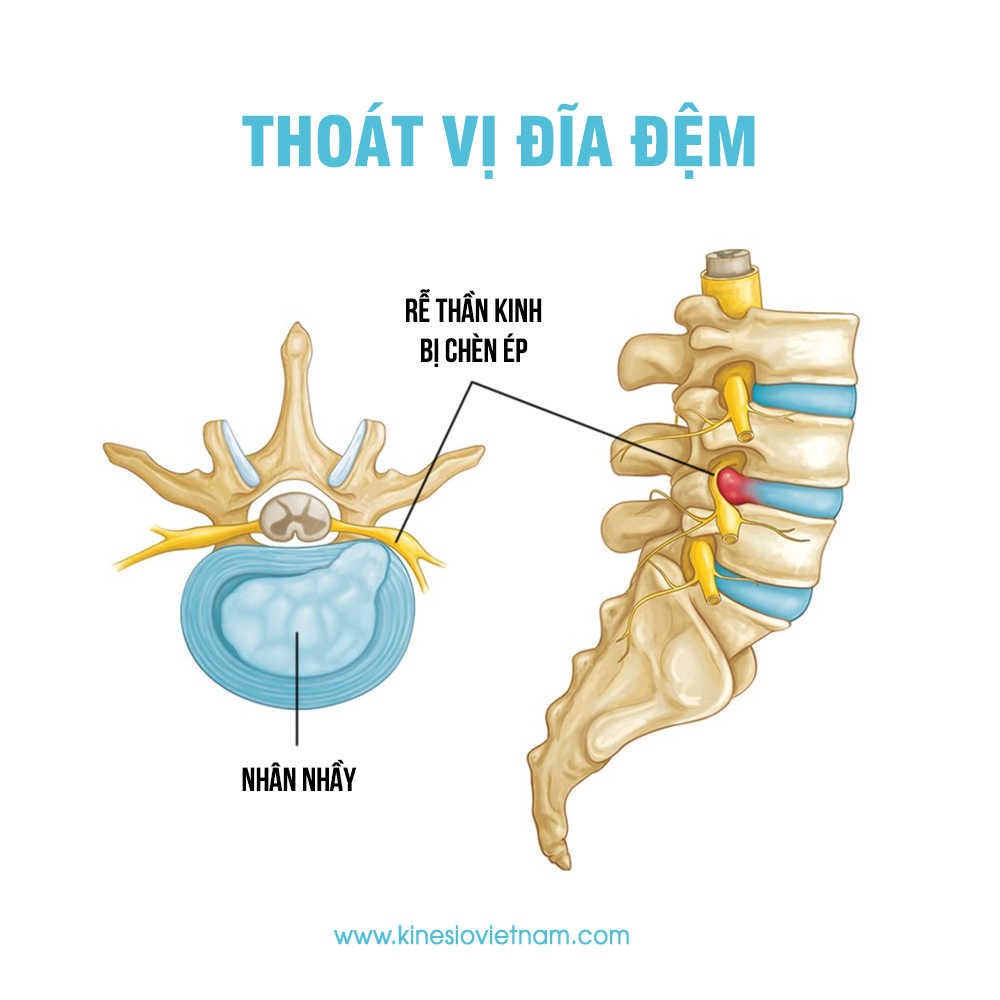 - Thoát vị đĩa đệm: Khi bệnh nhân bị thoát vị đĩa đệm có triệu chứng, bản thân đĩa đệm không đau nhưng nhân nhầy thoát ra từ bên trong đĩa đệm gây chèn ép hoặc kích thích dây thần kinh gần đó. Loại bệnh lý này gây ra đau rễ thần kinh, dẫn đến đau có thể lan sang các khu vực khác của cơ thể, chẳng hạn như từ lưng xuống chân hoặc từ cổ xuống cánh tay.