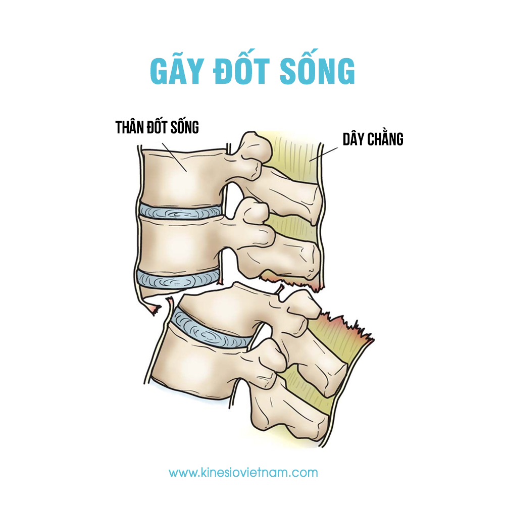 - Gãy đốt sống: Gãy đốt sống bao gồm gãy do nén đơn giản, trong đó xương tự xẹp xuống, bị đẩy vào nhau. Tình trạng tệ nhất trong số những chấn thương này là gãy-trật khớp, trong đó xương bị gãy nhưng do dây chằng cũng bị rách nên xương trượt ra vị trí ban đầu.